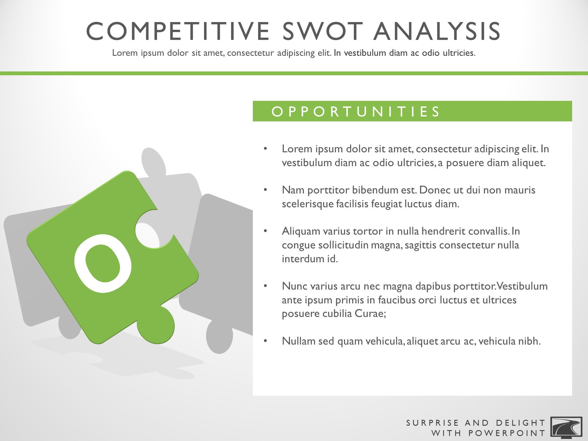 Help your audience to understand how each area of SWOT fits together with this jigsaw-style SWOT template. Your business's market standing and development goals will no longer be a puzzle!